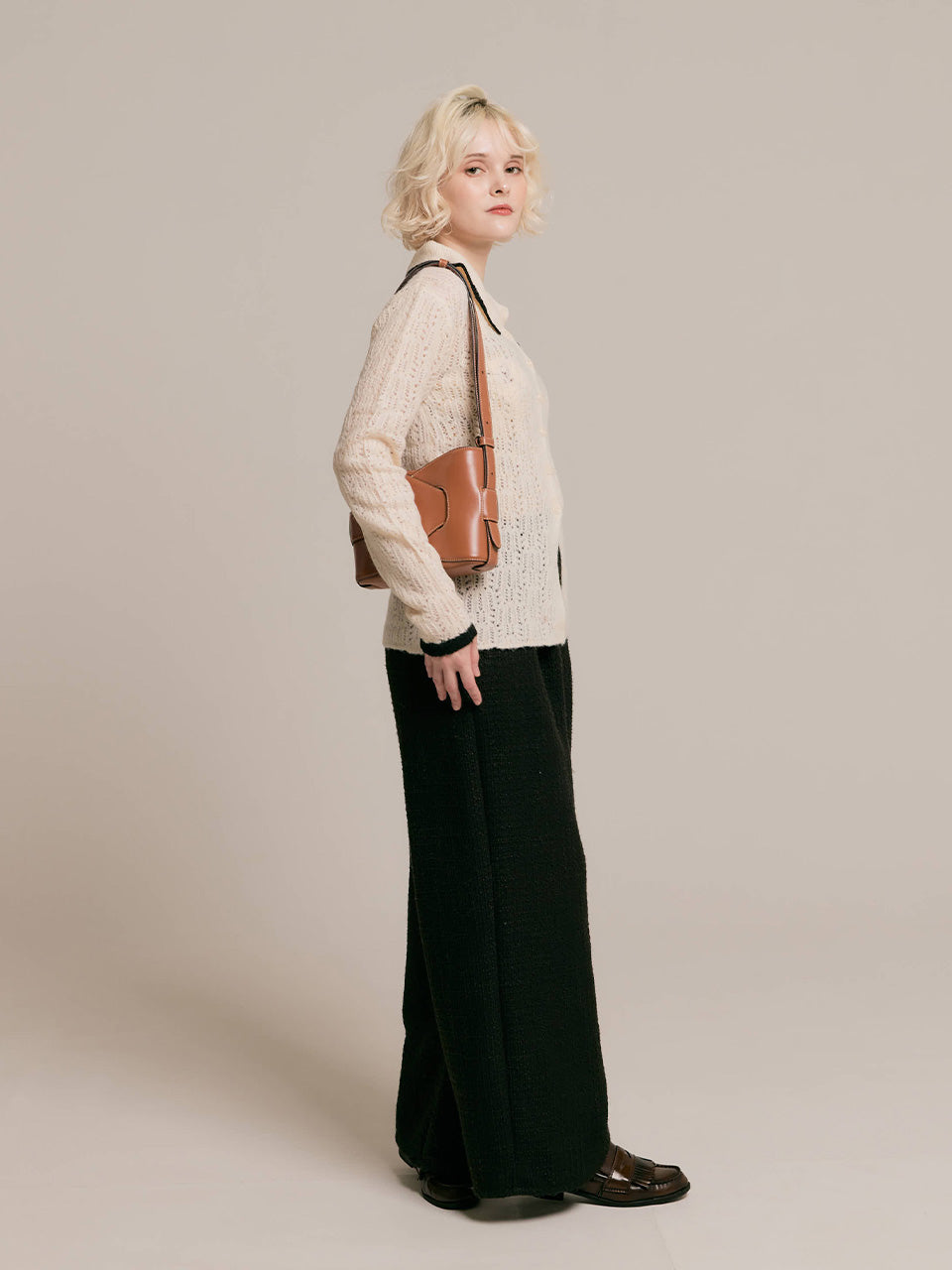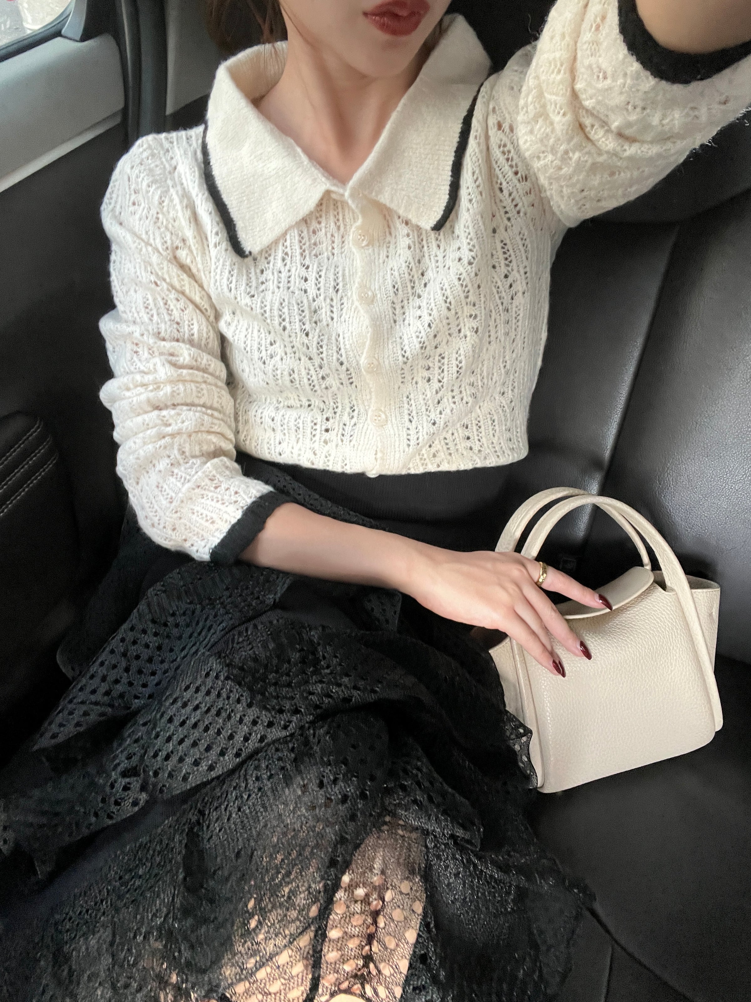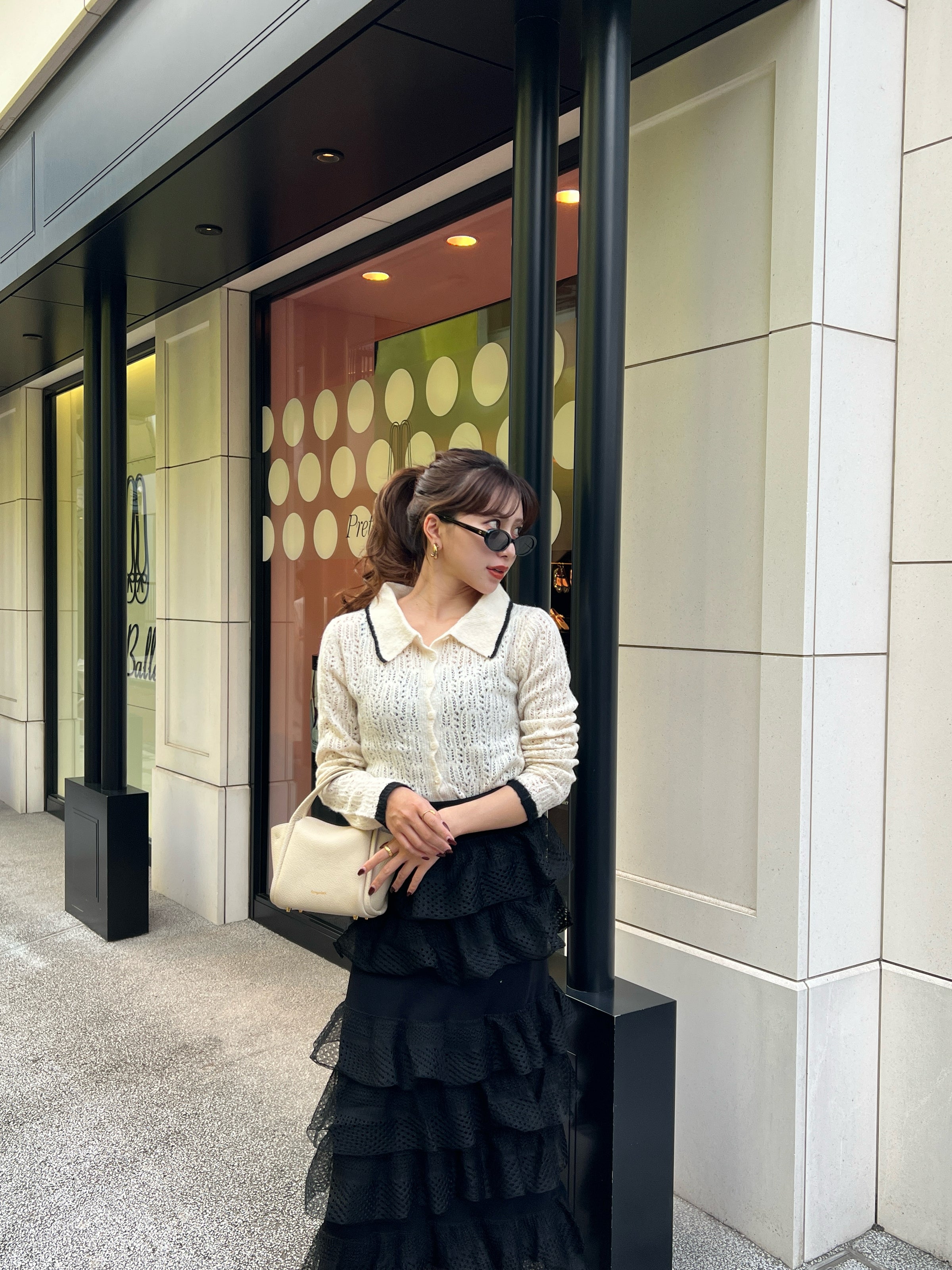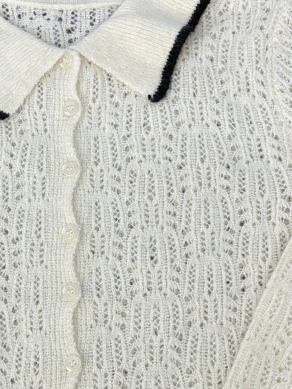 透かし編みの上品な表情が魅力の襟付きカーディガン。