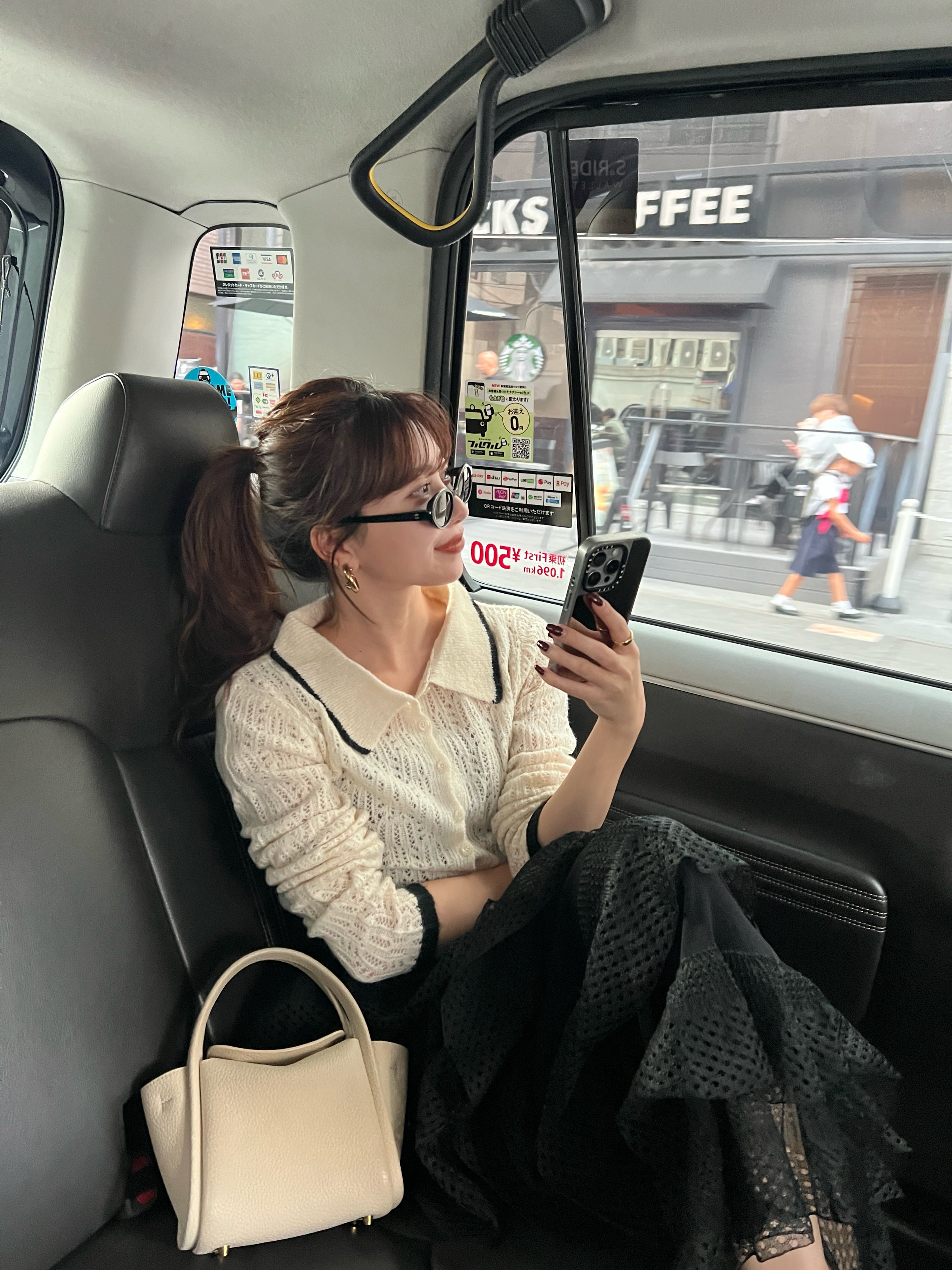 ふんわりと柔らかな風合いのアイボリーカラーに、襟元と袖口のブラックパイピングがアクセントを効かせ、クラシカルなムードを演出します。