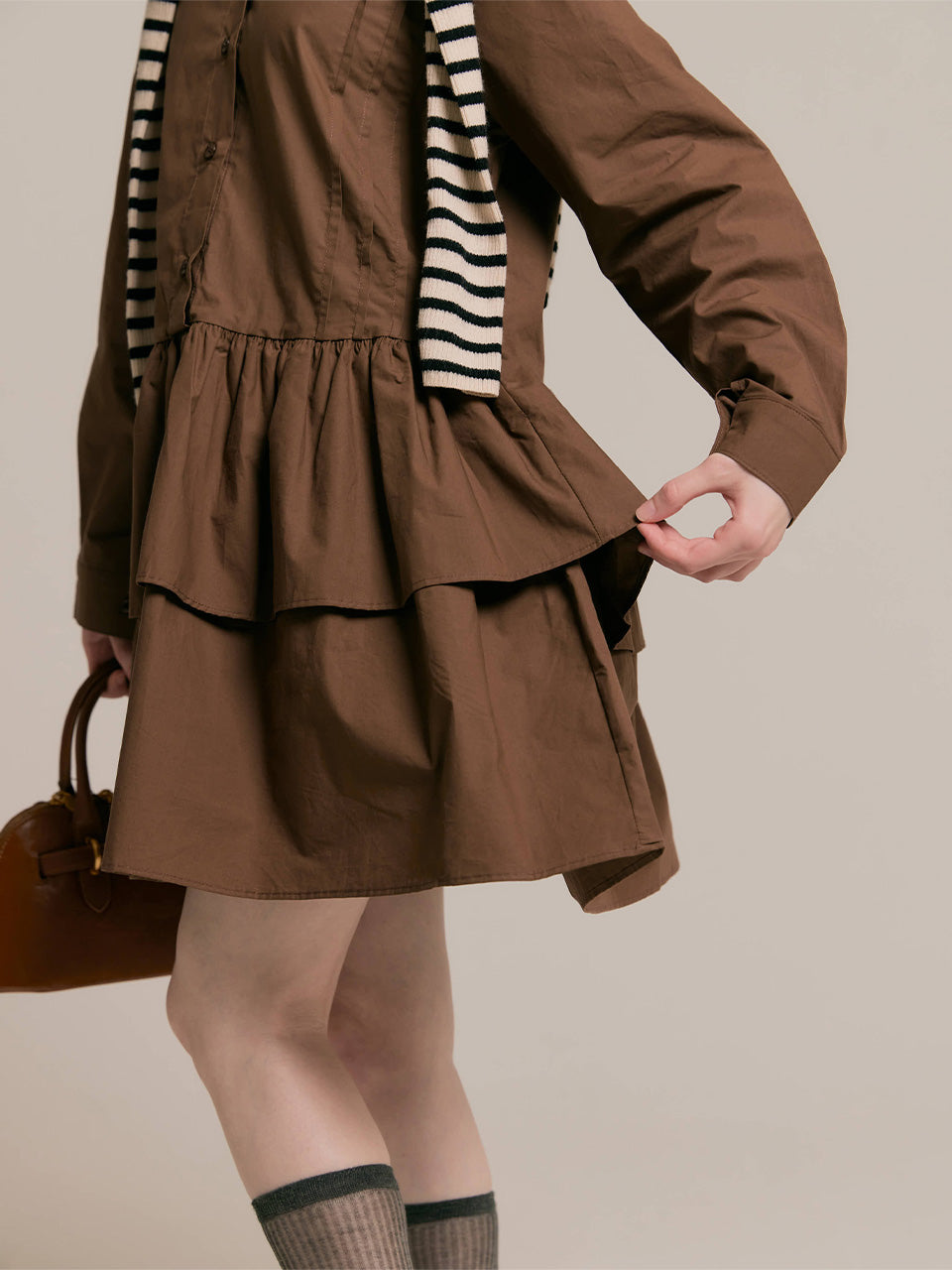 ふんわりと広がるティアードシルエットが魅力のシャツワンピース。